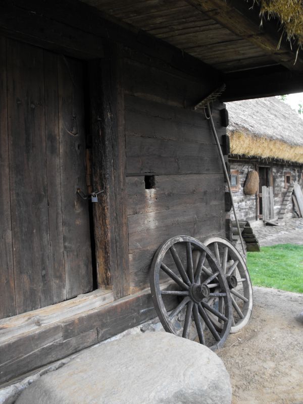 Spichlerz ze wsi Rakutowo. Obok drzwi znajduje się mały otwór – jest to specjalne wejście dla kota, aby pilnował zapasów przed szkodnikami.