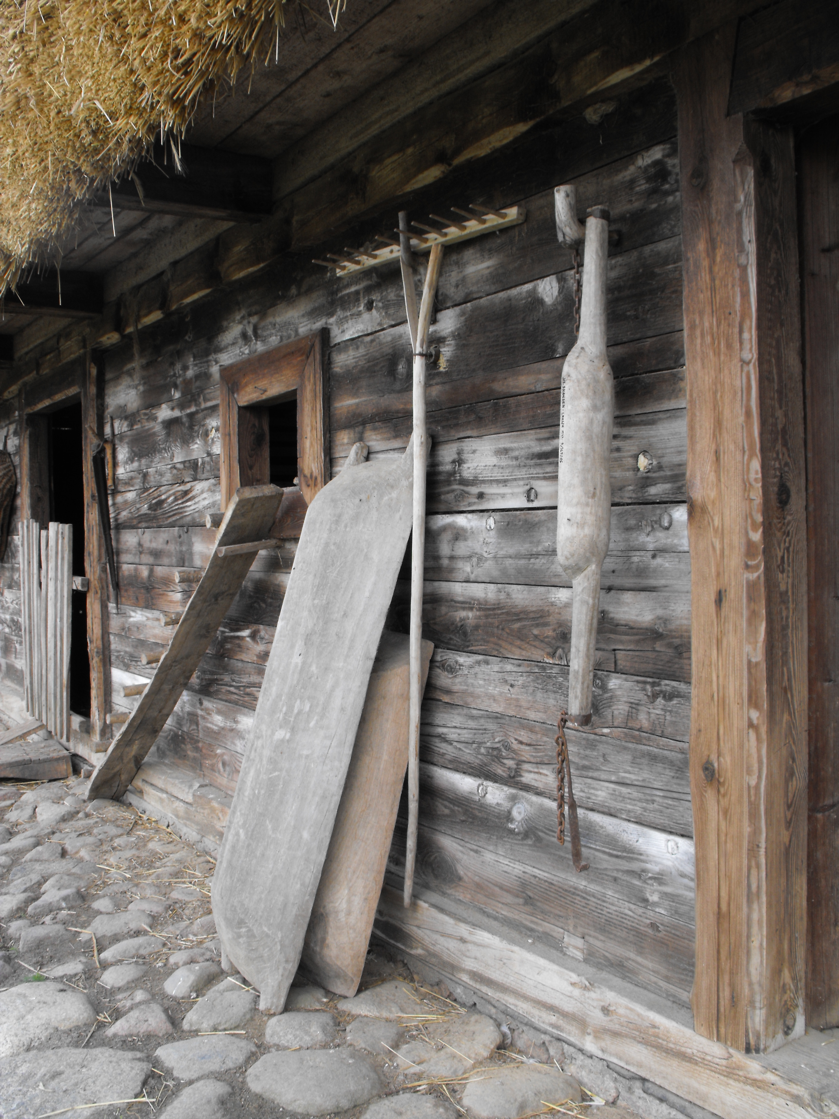 Budynek inwentarski ze wsi Skoki Duże z roku 1890. U wejścia do budynku widać pionowo ustawione koryto do parzenia świń. Budynek posiada ciekawą powałę, wykonaną z drążków oplecionych powrósłami ze słomy.