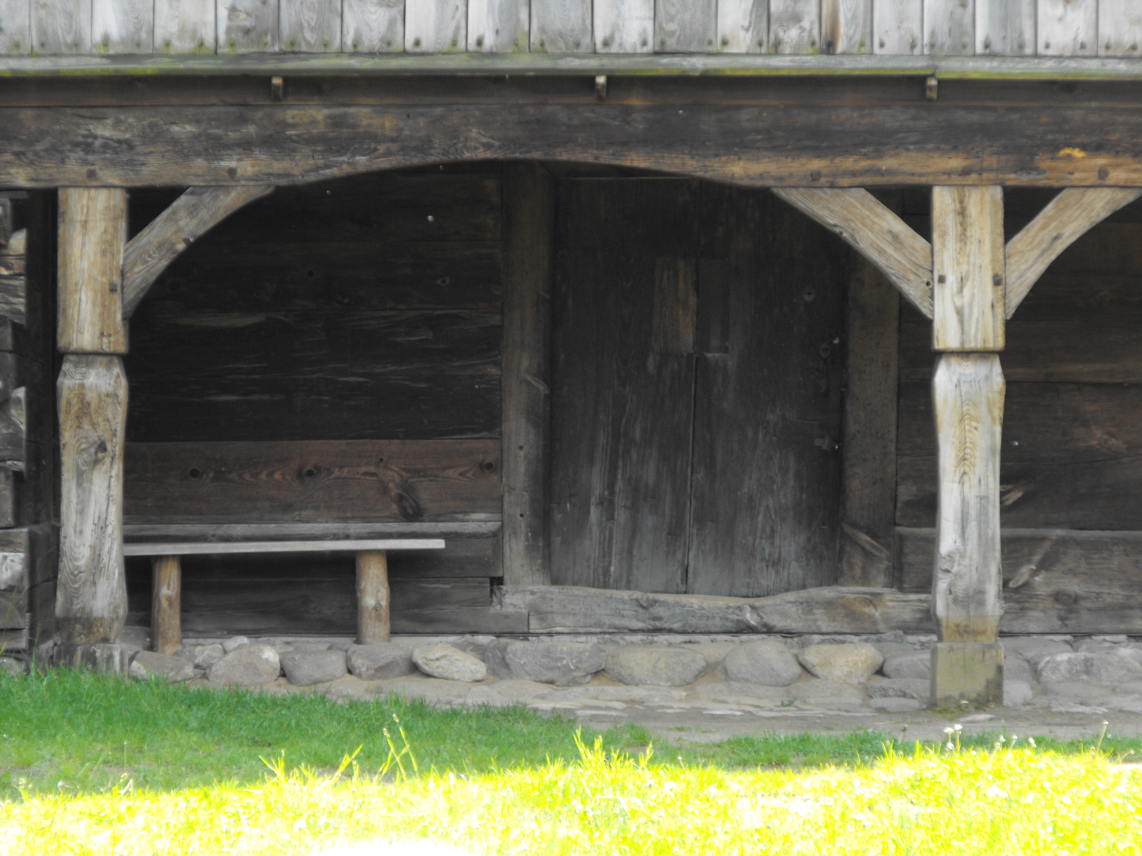 Chałupa dobrzyńska ze wsi Kamienny Smug. Na zdjęciu widoczny podcień narożny od strony szczytowej budynku. Podcień wsparty na trzech słupach. Widać wyraźnie niski strop.
