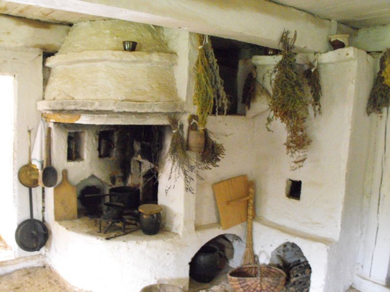 Wnętrze chałupy dobrzyńskiej ze wsi Kamienny Smug. Trzon do gotowania na otwartym ogniu, z zawieszonym nad nim kapturem oraz wejściem do pieca chlebowego. Na piecu garnki żeliwne, patelnie, gliniane dzbany, misy, tłuczki, moździerze.