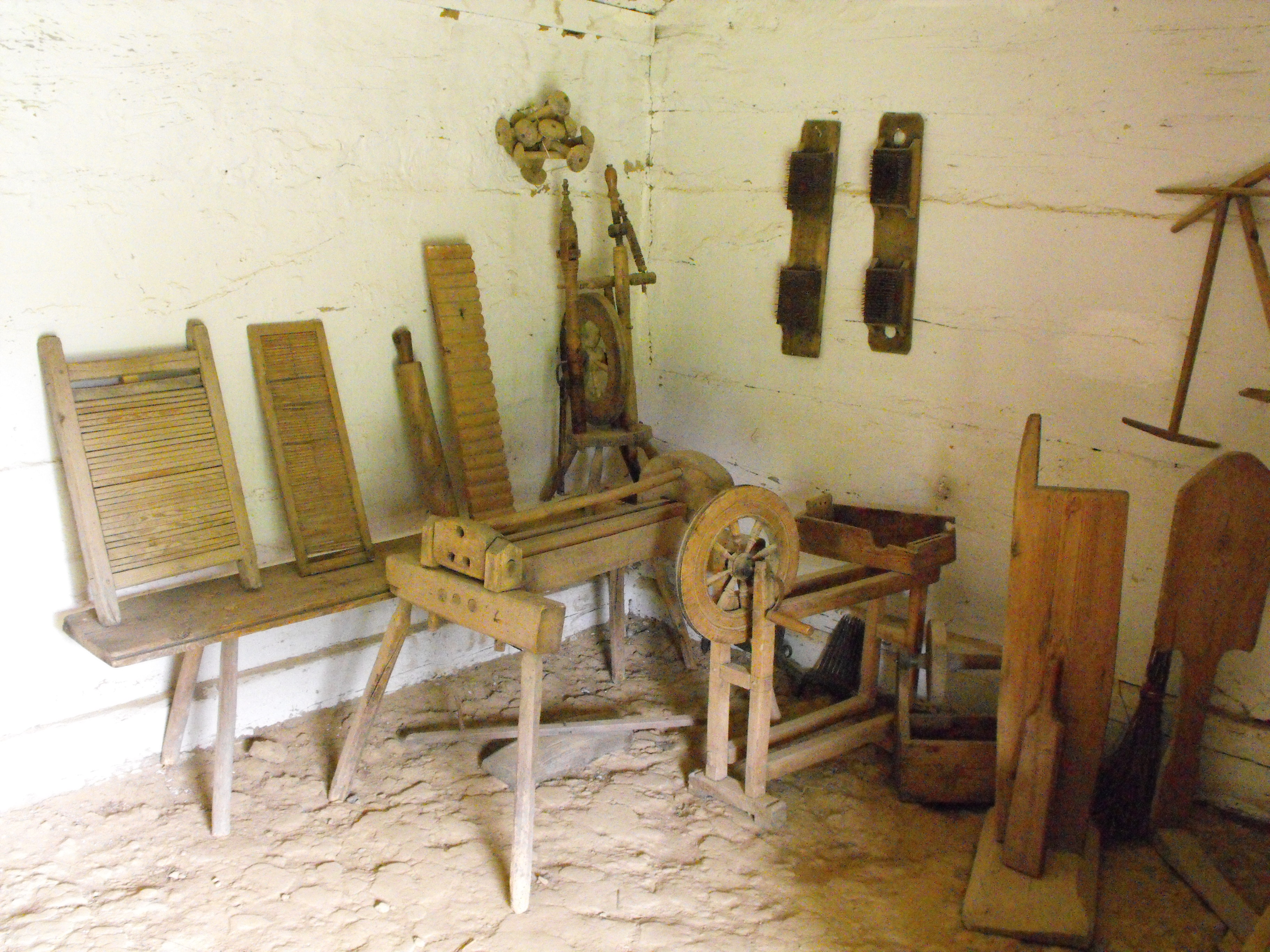 Wnętrze sieni w chałupie dobrzyńskiej. Wyposażenie pochodzące z przełomu XIX i XX wieku to różnego rodzaju sprzęty do obróbki lnu, kołowrotki, szpule.