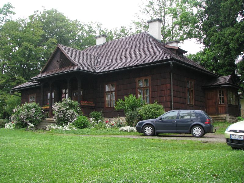 Drewniany mieszczański dwór z miejscowości Gorlice. Dwór szalowany gontem. Dach czterospadowy krytym gontem. Przed wejściem ganek wsparty na czterech kolumnach.