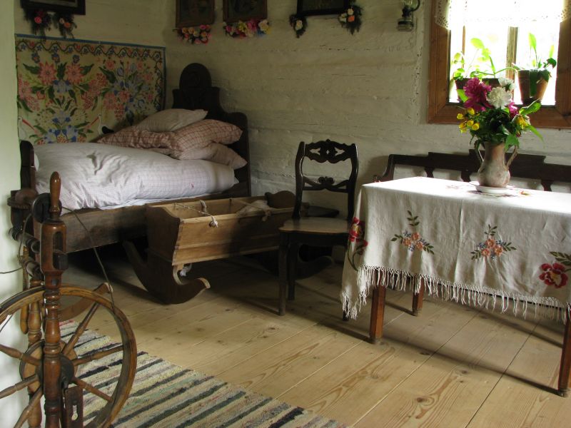 Wnętrze chałupy ze wsi Moszczenica. Wyposażenie izby. Widoczne łóżko, kołyska na biegunach, krzesło, stół oraz kołowrotek. Święte obrazy na ścianach przystrojone sztucznymi kwiatami. Podłoga z desek.