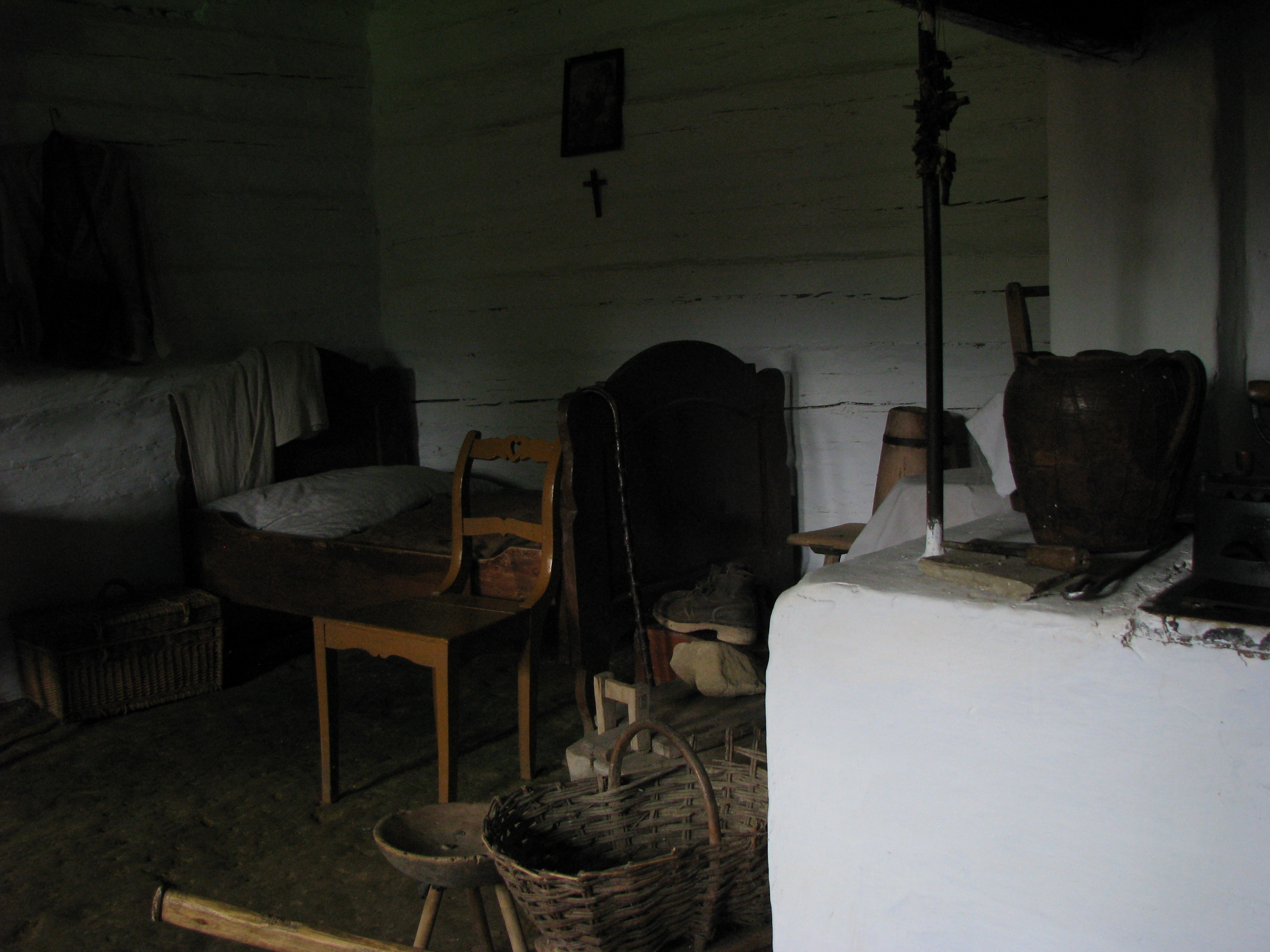 Wnętrze chałupy z Moszczenicy. Wyposażenie kuchni. Urządzenie ogniowe z zamkniętym paleniskiem (typ angielski) i z kapturem wspartym na metalowym słupie. Podłoga z polepy glinianej.