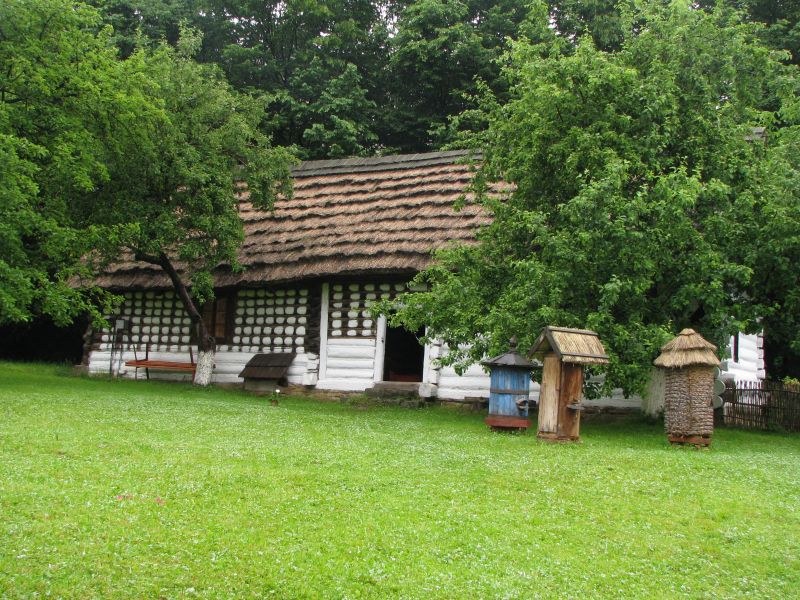 Pogórzańska chałupa ze wsi Gródek z połowy XIX wieku. Chałupa szerokofrontowa o konstrukcji zrębowej z węgłami łączonymi "na obłap". Dach czterospadowy kryty słomą kładzioną schodkowo. Kalenica zabezpieczona gontem. Ściany pomalowane w charaktertsyczne białe wzory. Przed chałupą ul pleciony i dwa ule zbite z desek. |