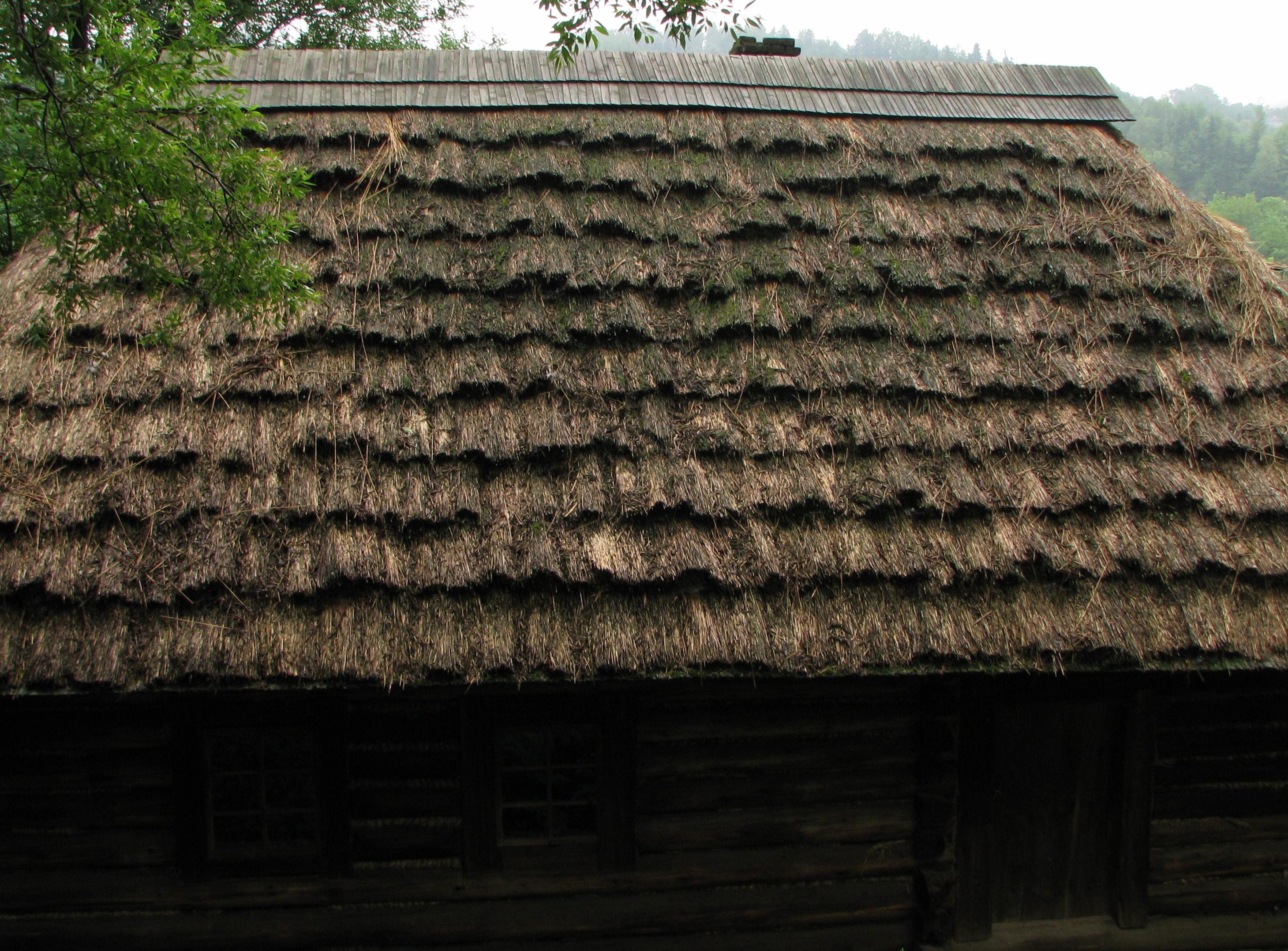 Dach olejarni pogórzańskiej ze wsi Gródek (koło Grybowa). Dach czterospadowy kryty schodkowo słomą. Kalenica zabezpieczona gontem.