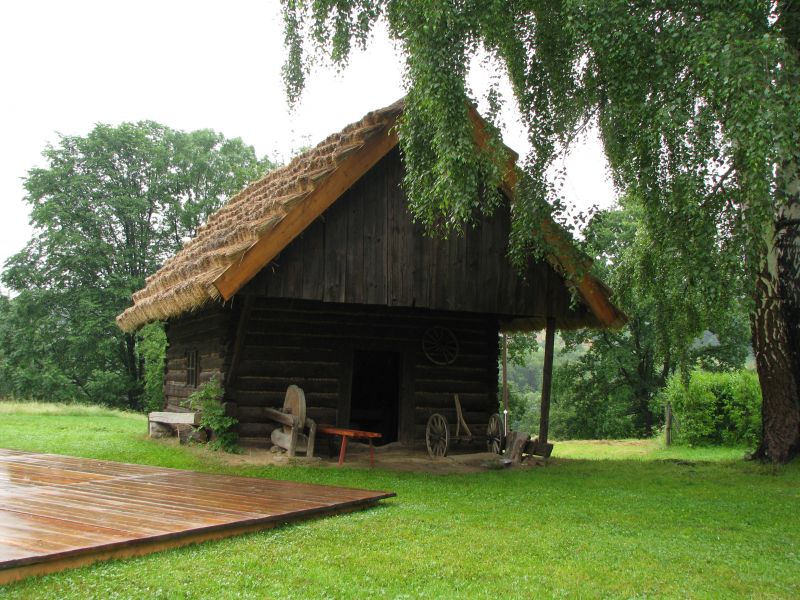 Kuźnia ze wsi Turze. Budynek o konstrukcji zrębowej z węgłami łączonymi "na obłap". Zrąb uszczelniany słomą. Podcień wsparty na dwóch słupach przed wejściem. Dach dwuspadowy kryty słomą kładzioną schodkowo. Przed kuźnią stoi koło do ostrzenia narzędzi.