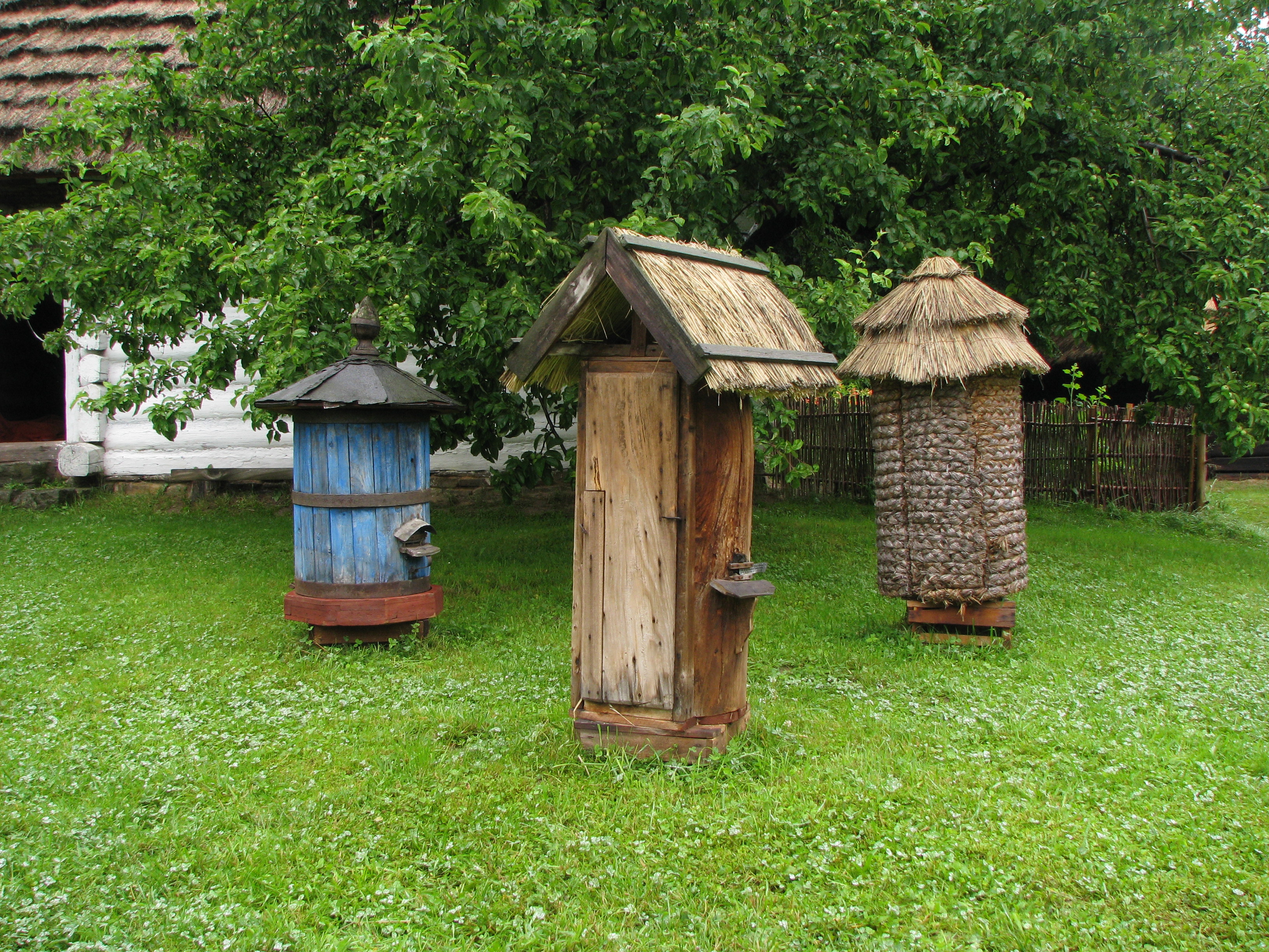 Ekpozycja uli. Ule kłodowe oraz ul słomiany wypleciony w formie walca ustawiony na drewnianej podstawie i nakryty słomianym dachem.