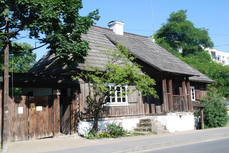 Główna chałupa mieszkalna biłgorajskiej zagrody sitarskiej, sfotografowana od frontu od ulicy Nadstawnej. Na zdjęciu widać charakterystyczne dla biłgorajskich chałup, w tym zwłaszcza dla chałup sitarzy, duże dwunastoczęściowe okna. Dach czterospadowy kryty gontem.