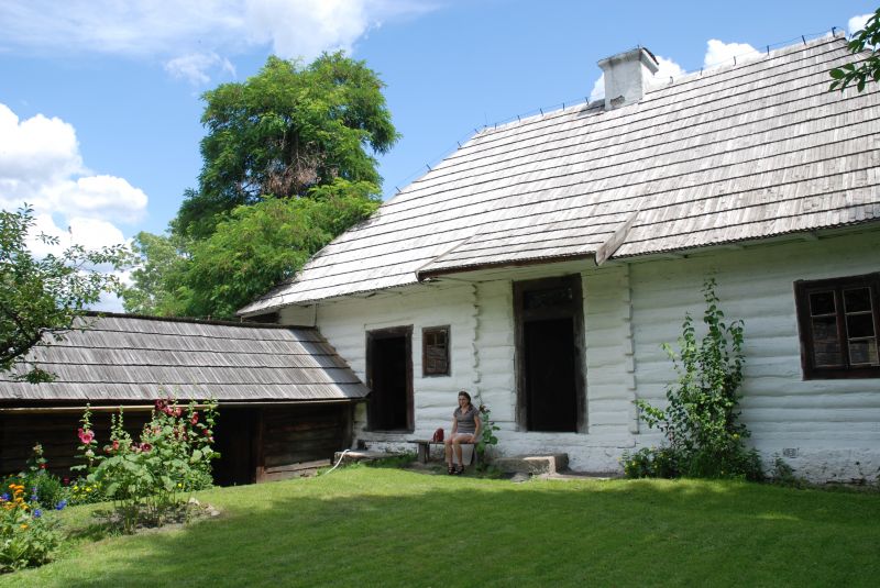 Podwórze zagrody sitarskiej w Biłgoraju. Na zdjęciu północno-wschodni róg zagrody z drewutnią i chałupą mieszkalną. Dach chałupy kryty gontem. Ściany bielone wapnem.