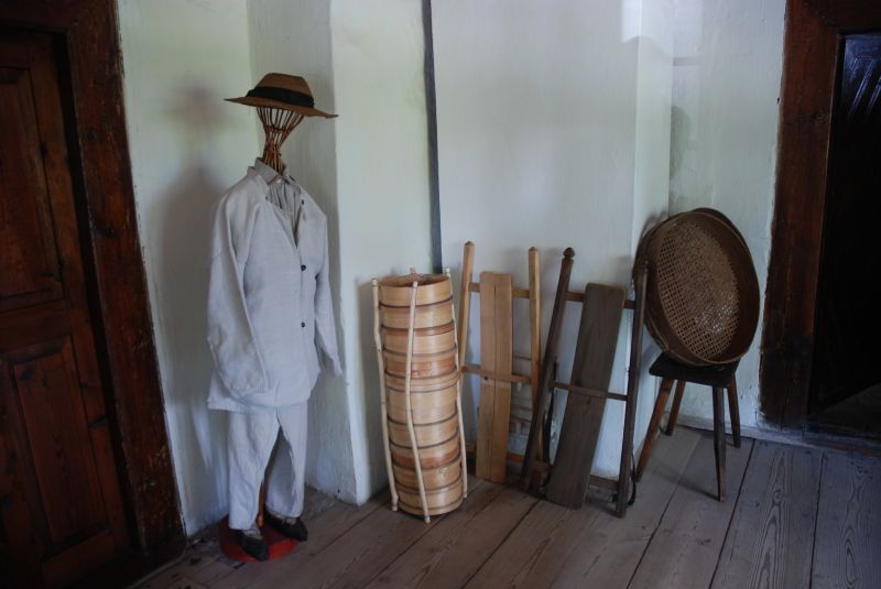 Tradycyjny strój sitarski „stogi”, nosze i przetaki we wnętrzu warsztatu. Gotowe sita układano w tak zwane „, stogi”, przytraczano do noszy, a nosze zakładano na plecy.