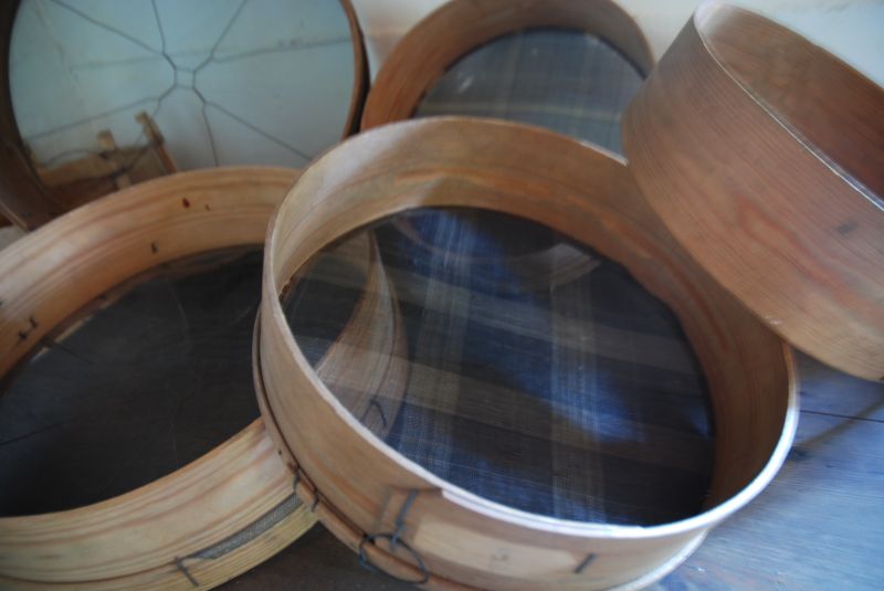 Gotowe sita z kolorowymi, barwionymi naturalnymi farbami „płócienkami” z włosia końskiego - element ekspozycji.