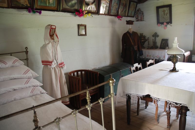 Izba biała, reprezentacyjne miejsce domu wraz z ekspozycją tradycyjnych strojów sitarzy biłgorajskich. Na komodzie za strojem męskim widać rosyjski samowar – pozostałość po ostatnich mieszkańcach zagrody i dowód na to, że sitarstwo było zajęciem dochodowym.