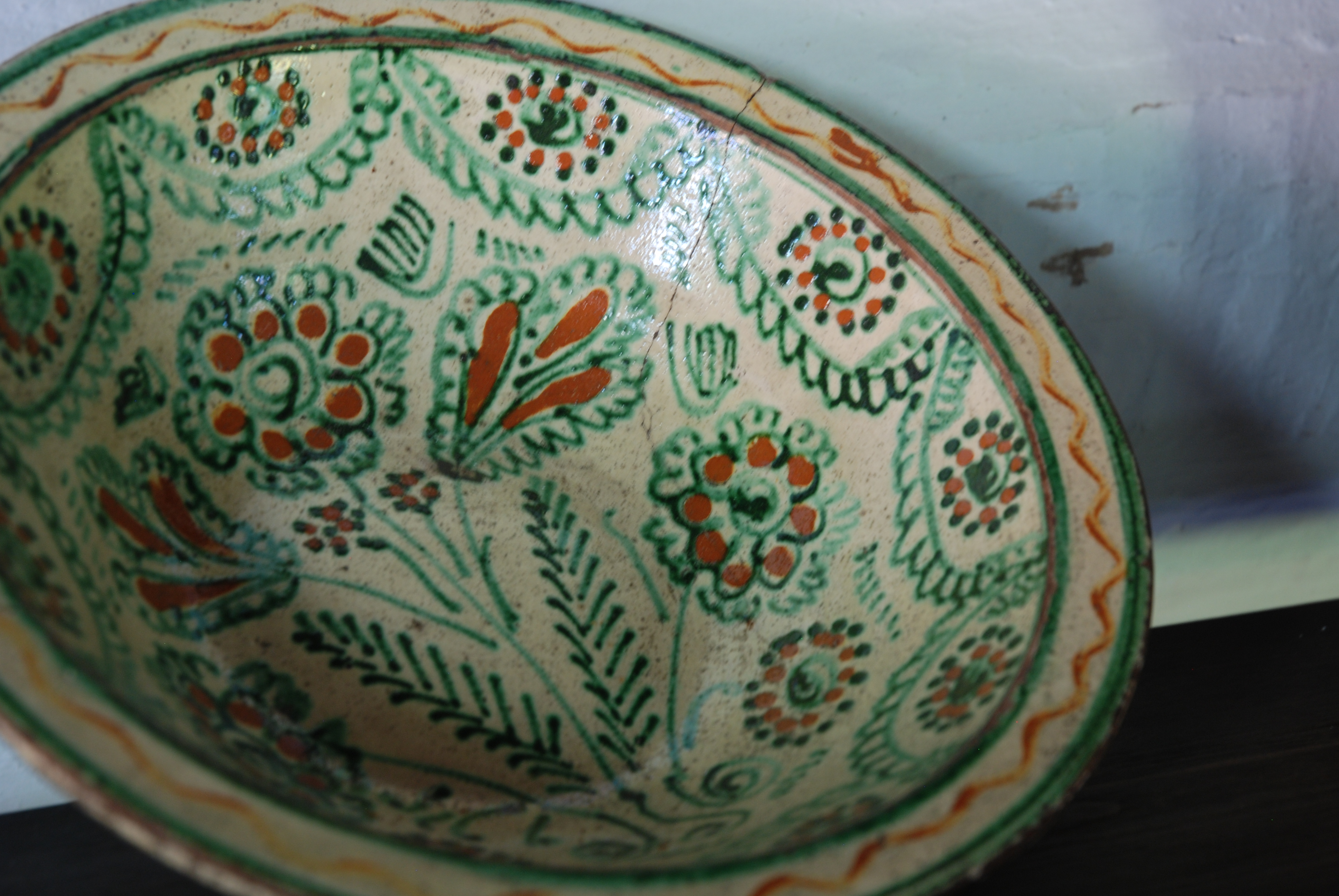 Malowany talerz na regale w czarnej kuchni -element ekspozycji.