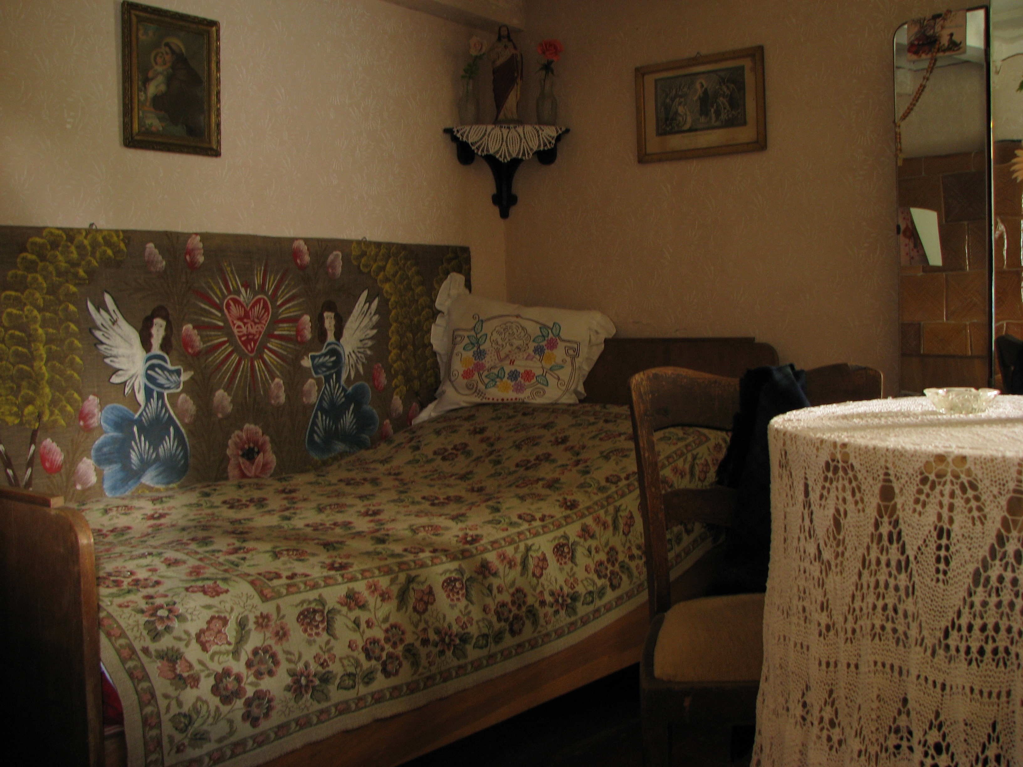 Wnętrze chałupy rybackiej, tradycyjny wystrój pokoju gościnnego.