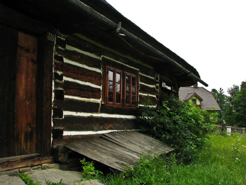 Ściana frontowa babiogórskiej chałupy Słopiakowej i zejście do piwniczki mieszczącej się pod budynkiem. Chałupa szerokofrontowa o konstrukcji zrębowej z węgłami łączonymi na "obłap" bez ostatków. Wypełnienie zrębu pobielone. Fundament z kamienia.