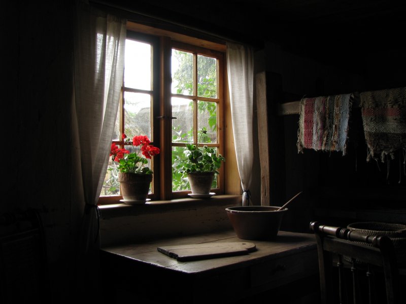 Wnętrze chałupy gburskiej. Na zdjęciu widoczny stolik pod oknem, z prawej strony znajduje się warsztat tkacki.