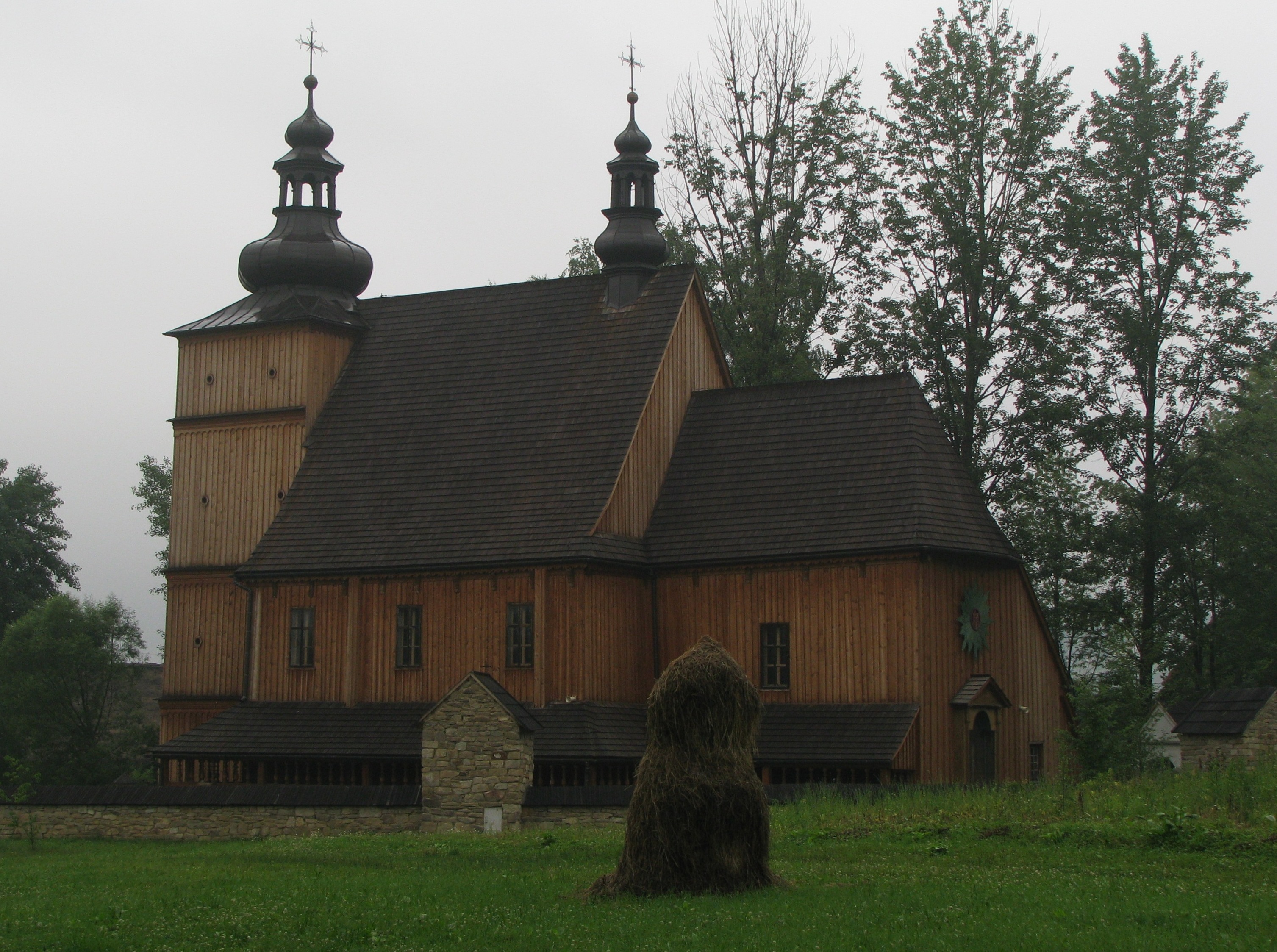 Kościół katolicki ze wsi Łososina Dolna (koło Rożnowa) z 1739 roku. Budynek trójdzielny z prezbiterium, nawą i kruchtą. Kościół o konstrukcji zrębowej oszalowanej pionowo deskami. Dach o różnych kalenicach wielopołaciowy kryty gontem. Dwie kopulaste wieże: jedna - większa - wieńcząca kruchtę i druga -mniejsza - na szczycie dachu nawy. Większa wieża pseudoizbicowa o konstrukcji na słup została dostawiona w II połowie XVIII wieku. Kościół otaczają soboty - parterowe podcienie będące schronieniem dla wiernych lub pielgrzymów czekających na nabożeństwo. Soboty o konstrukcji słupowej z daszkiem pulpitowym ogrodzone balustradą. |