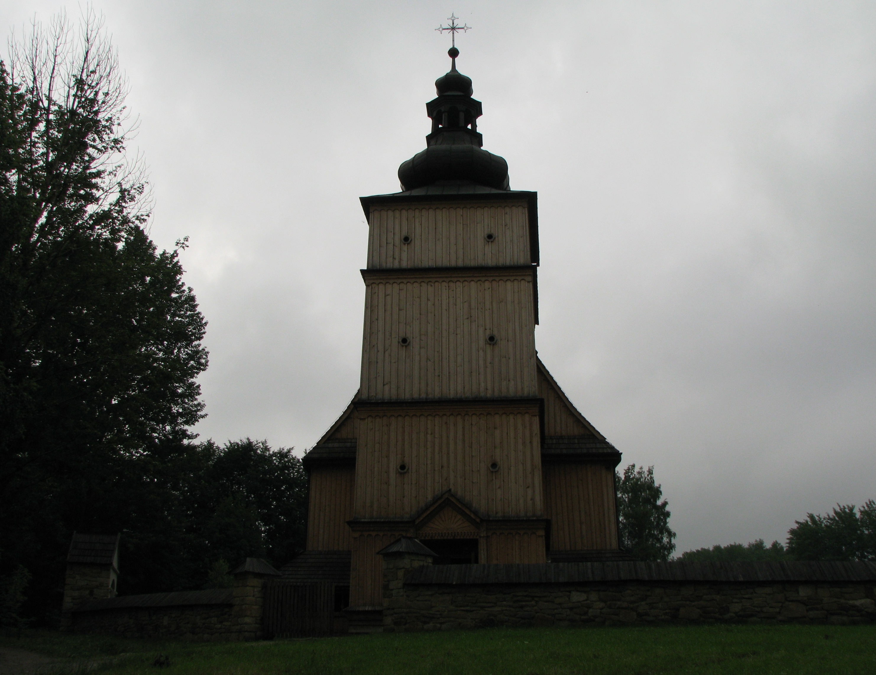 Kościół katolicki ze wsi Łososina Dolna (koło Rożnowa) z 1739 roku. Na zdjęciu widoczne wejście oraz wieża wieńcząca kruchtę. Kościół o konstrukcji zrębowej oszalowanej pionowo deskami. Wieża pseudoizbicowa o konstrukcji na słup została dostawiona w II połowie XVIII wieku.