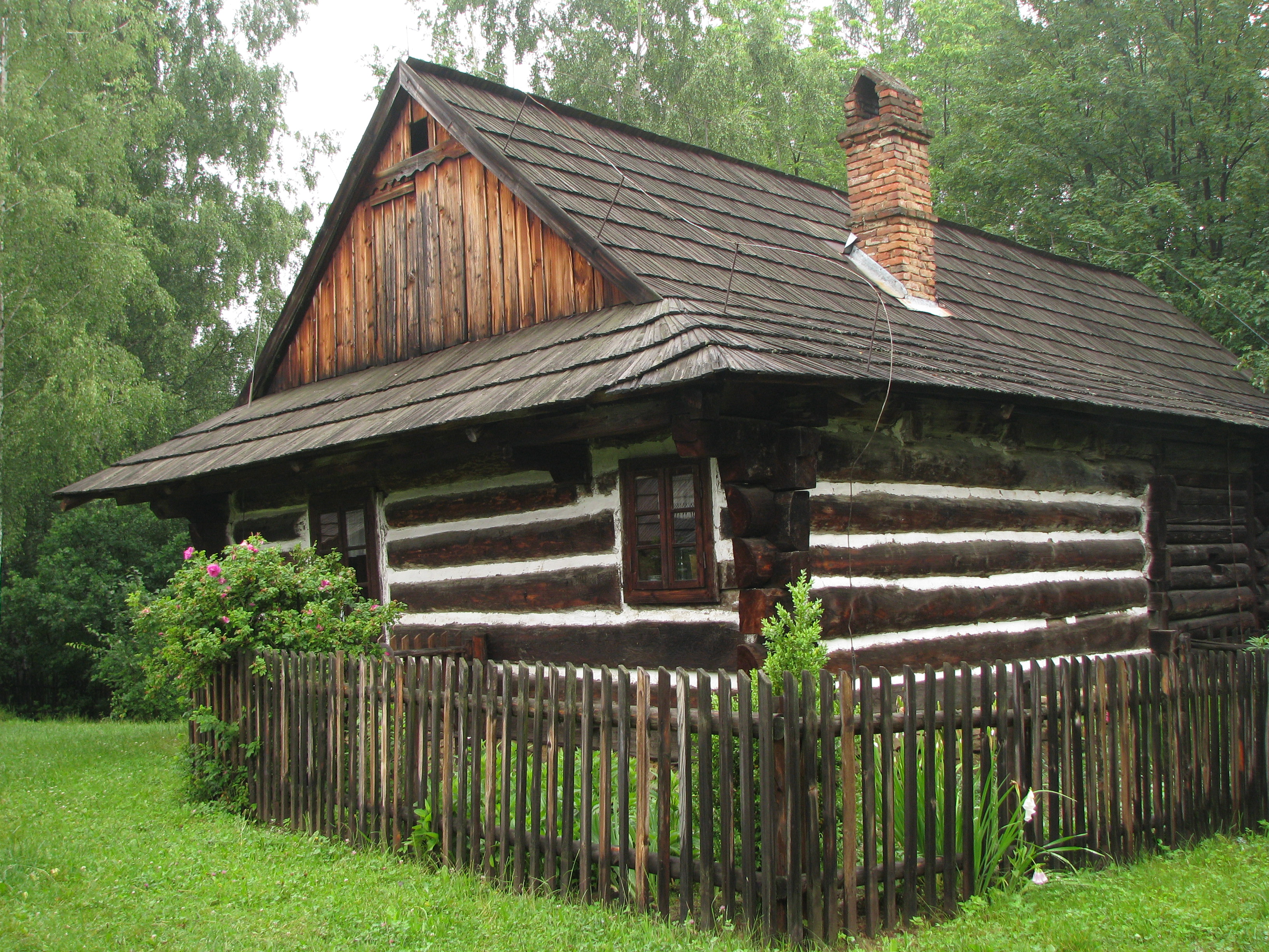 Chałupa maziasrka z łemkowskiej wsi Łosie. Konstrukcja zrębowa z narożami łączonymi „na obłap”. Dach półszczytowy kryty gontem. Uszczelnienia między balami są charakterystycznie bielone.