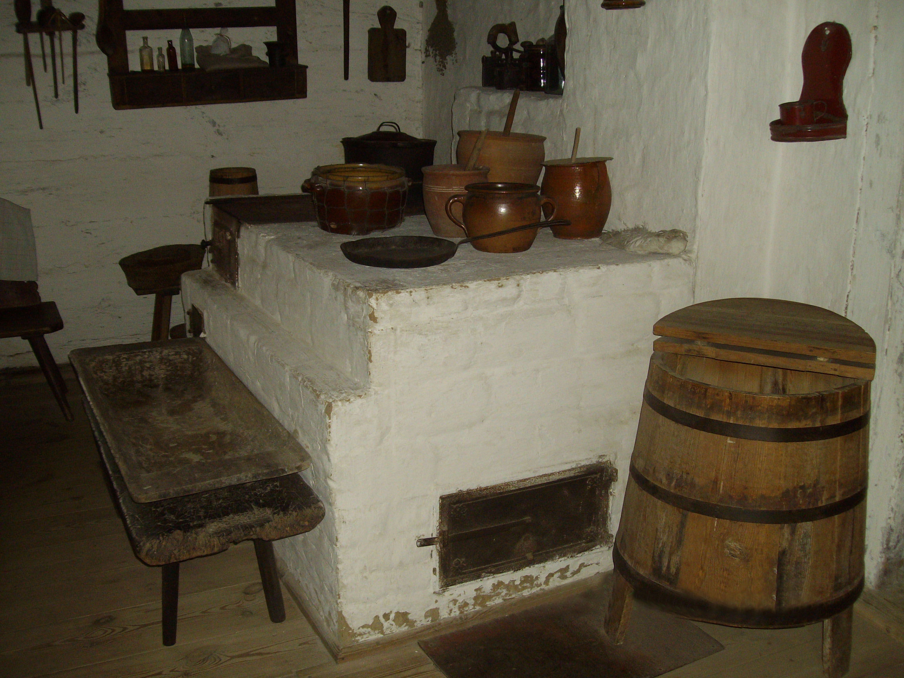 Wnętrze chałupy średniozamożnego gospodarza ze wsi Wolica (okolice Kalisza) z 1841 roku. Piec oraz naczynia kuchenne używane dawniej w Wielkopolsce.