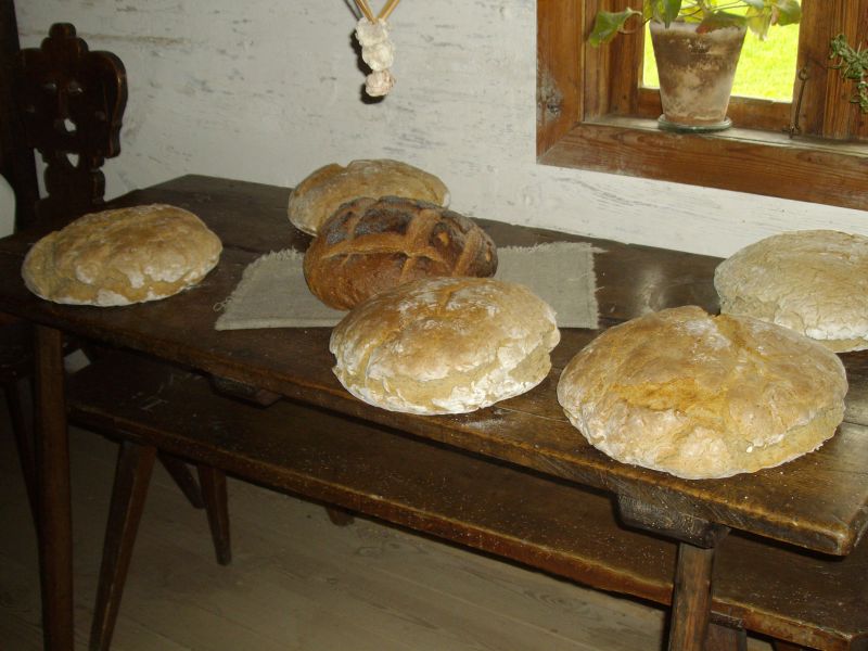 Chleb wypieczony w piecu chlebowym w na stole wewnątrz chałupy średniozamożnego gospodarza ze wsi Wolica.