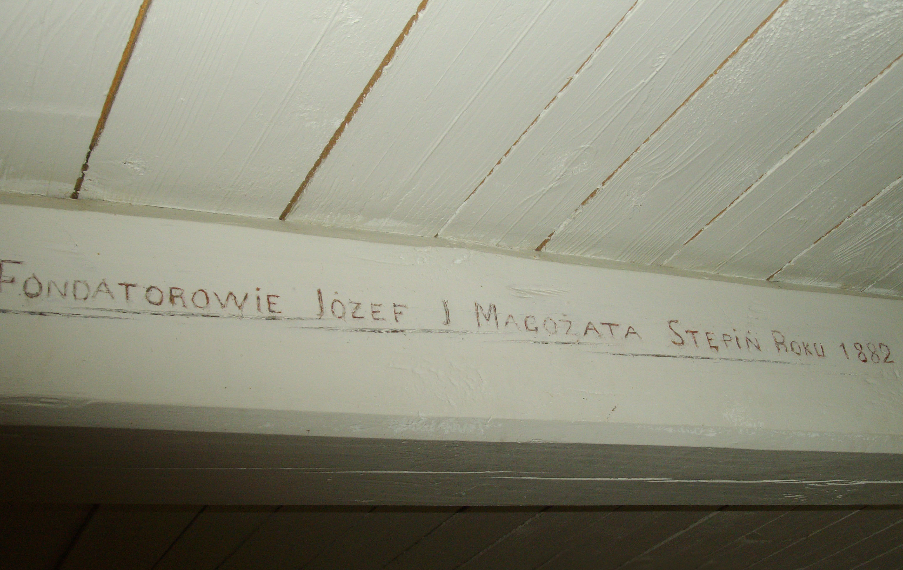 Imiona i nazwisko fundatorów domu (Józef i Małgorzata Stępień) oraz data wybudowania chałupy (1882 r) na belce stropowej w chałupie ze wsi Dobrzec.