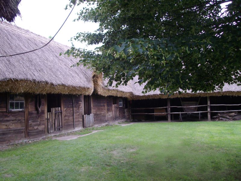 Fragment zagrody należącej do bogatszego gospodarza ze wsi Dobrzec, z końca XIX wieku. Widok na budynek inwentarski i wozownię. Budynek o konstrukcji sumikowo-łątkowej. Dach kryty słomianą strzechą.