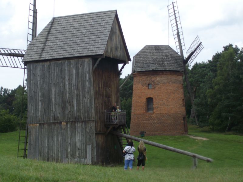 Wiatraki. Na pierwszym planie wiatrak typu koźlak z 1801 roku ze wsi Mierzewo (gmina Niechanowo). Wiatrak o konstrukcji słupowej szalowanej pionowo deskami. Budynek o trzech kondygnacjach. Dach dwuspadowy z naczółkiem od strony skrzydeł. Na drugim planie wiatrak typu holender z 1810 roku ze wsi Trzuskołoń. Wiatrak murowany z cegły. Budynek czterokondygnacyjny o formie ściętego stożka nakryty "czapą". |