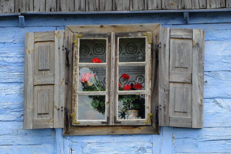Okno chałupy ze wsi Czermno z 1900 roku. Okno dwuskrzydłowe z okuciami kowalskimi i drewnianymi okiennicami. Ściany pomalowane wapnem zmieszanym z ultramaryną.