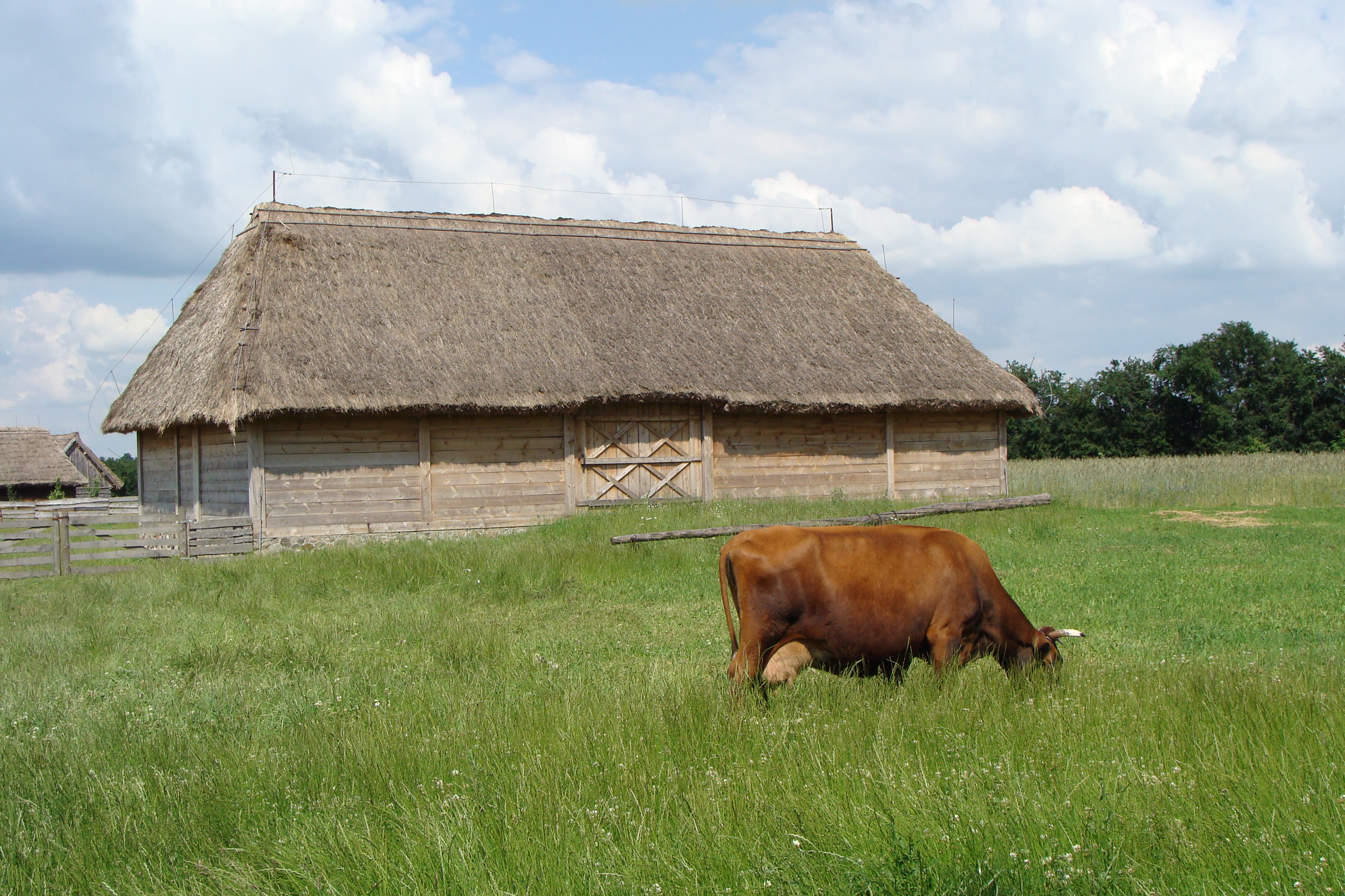 Drewniana stodoła ze wsi Rębowo. Budynek o konstrukcji sumikowa-łątkowej. Dach czterospadowy pokryty słomą.