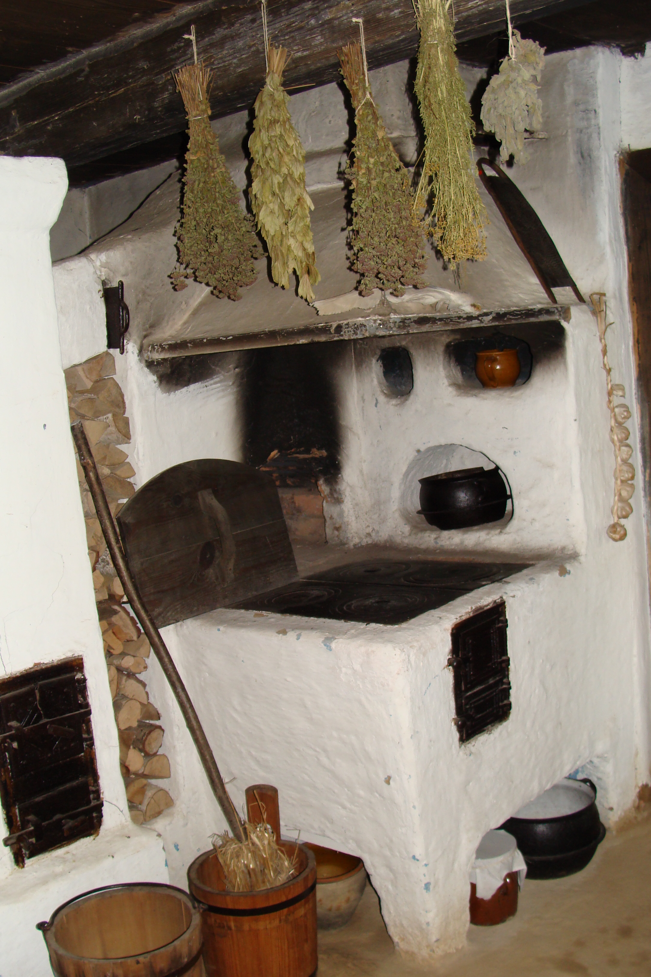 Piec w izbie kuchennej chałupy ze wsi Izdebno z początku lat dwudziestych XX wieku. Piec z paleniskiem zamkniętym (typ angielski) i osłaniającym je kapturem. Podłoga z polepy glinianej.