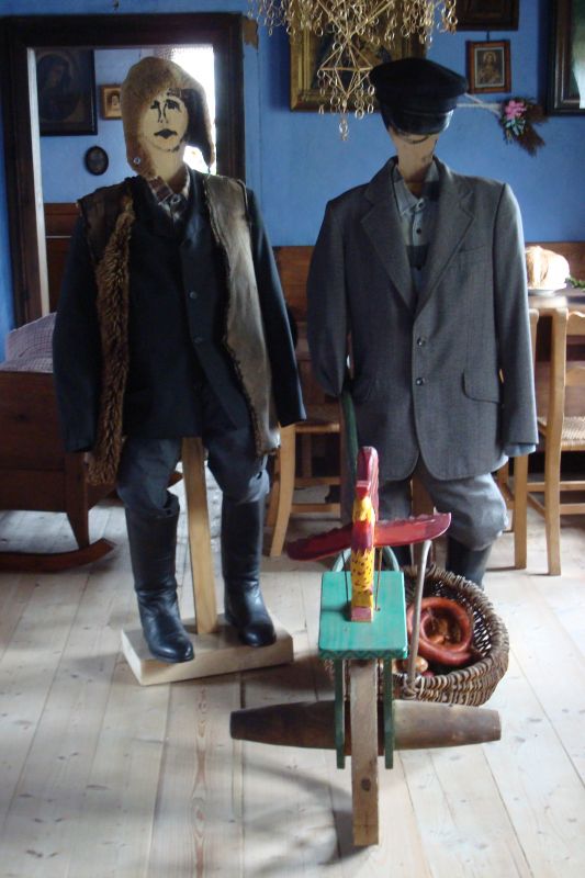 Drewniana zabawka dziecięca z okresu wielkanocnego i strój chłopski z dwudziestolecia międzywojennego.