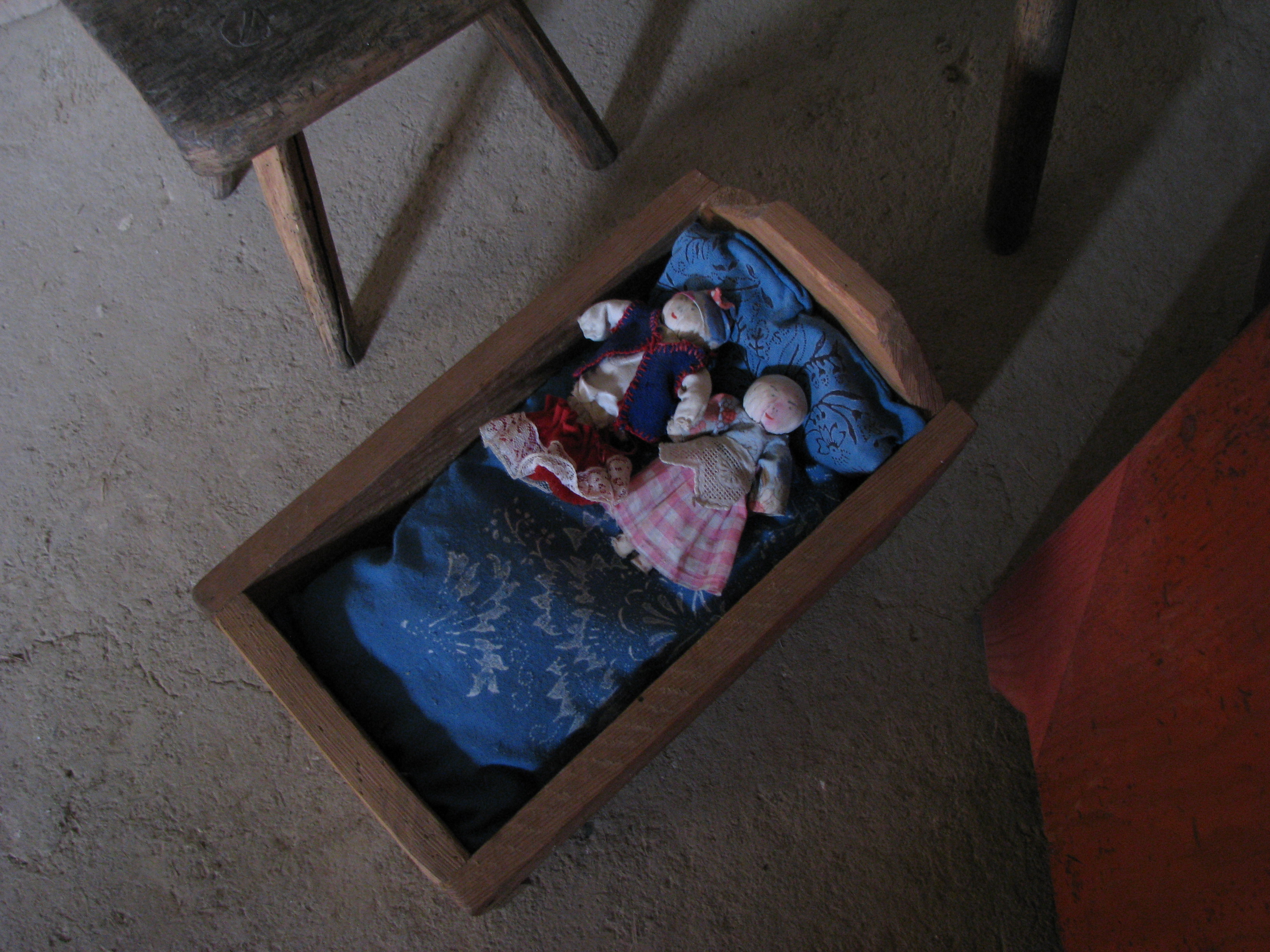 Drewniana Kołyska do zabawy dla dzieci z leżącymi wewnątrz lalkami. Element wystroju chałupy bogatego chłopa ze wsi Rakutowo z XVIII i XIX wieku.