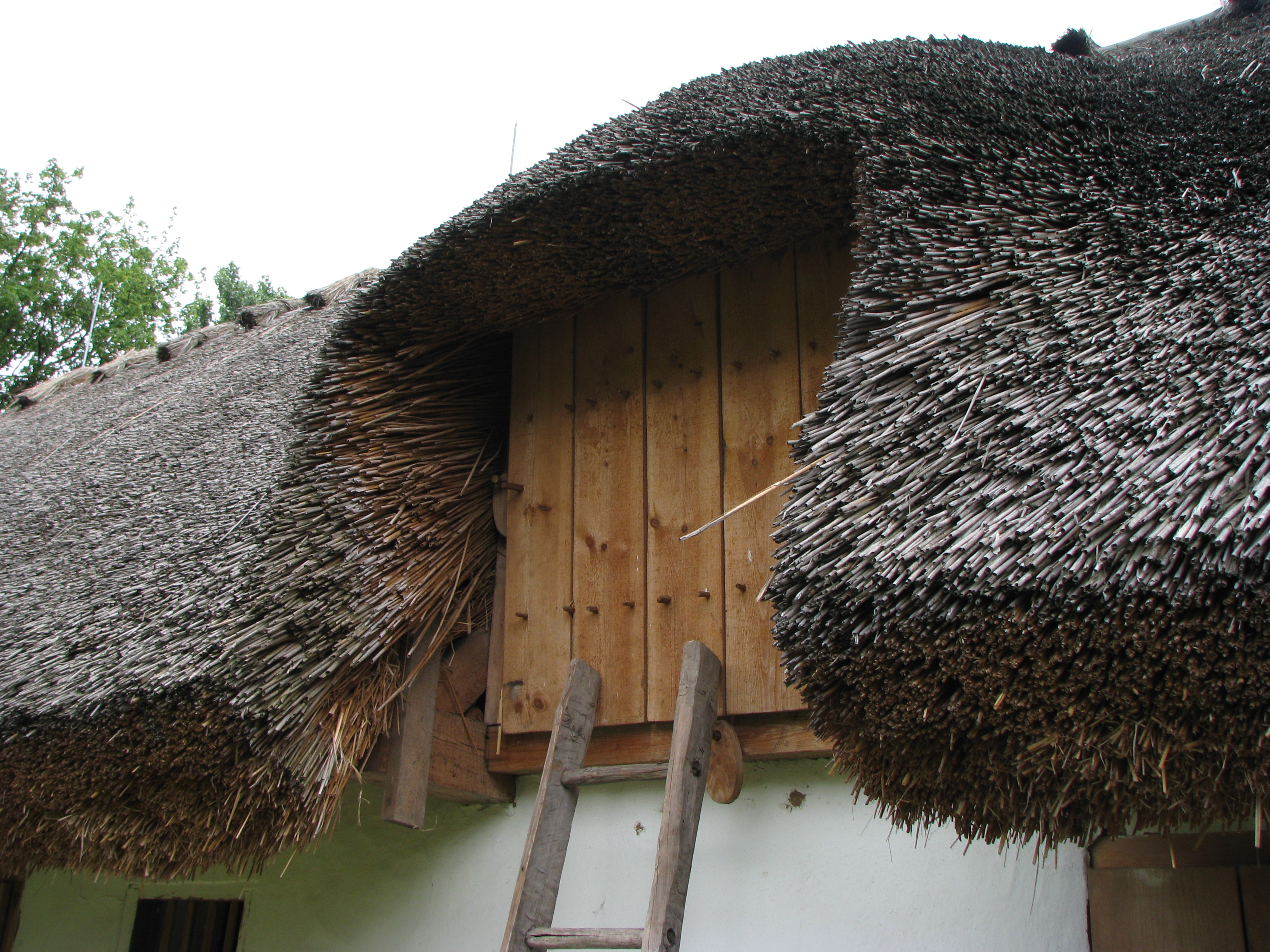 Budynek inwentarski ze wsi Rakutowo z II połowy XIX wieku. Na zdjęciu widoczne wejście na strych oraz pokrycie dachu - słoma kładziona "na płasko" w miejscu wejścia na strych tworząca "bawole oko".