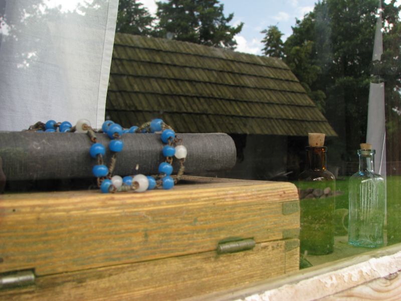 Zagroda z Borów Tucholskich. Na zdjęciu widoczna wąskofrontowa zrębowa chałupa ze stajnią, z pierwszej połowy XIX wieku ze wsi Sucha. Na zdjęciu okno i wiodczne za szybą butelki, modlitewnik oraz różaniec.