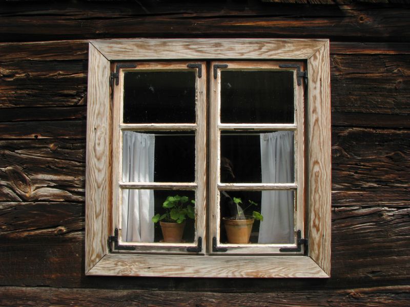 Okno chałupy e wsi Sucha z I połowy XIX wieku. Okno drewniane, dwuskrzydłowe z kowalskimi okuciami. Chałupa o konstrukcji zrębowej.