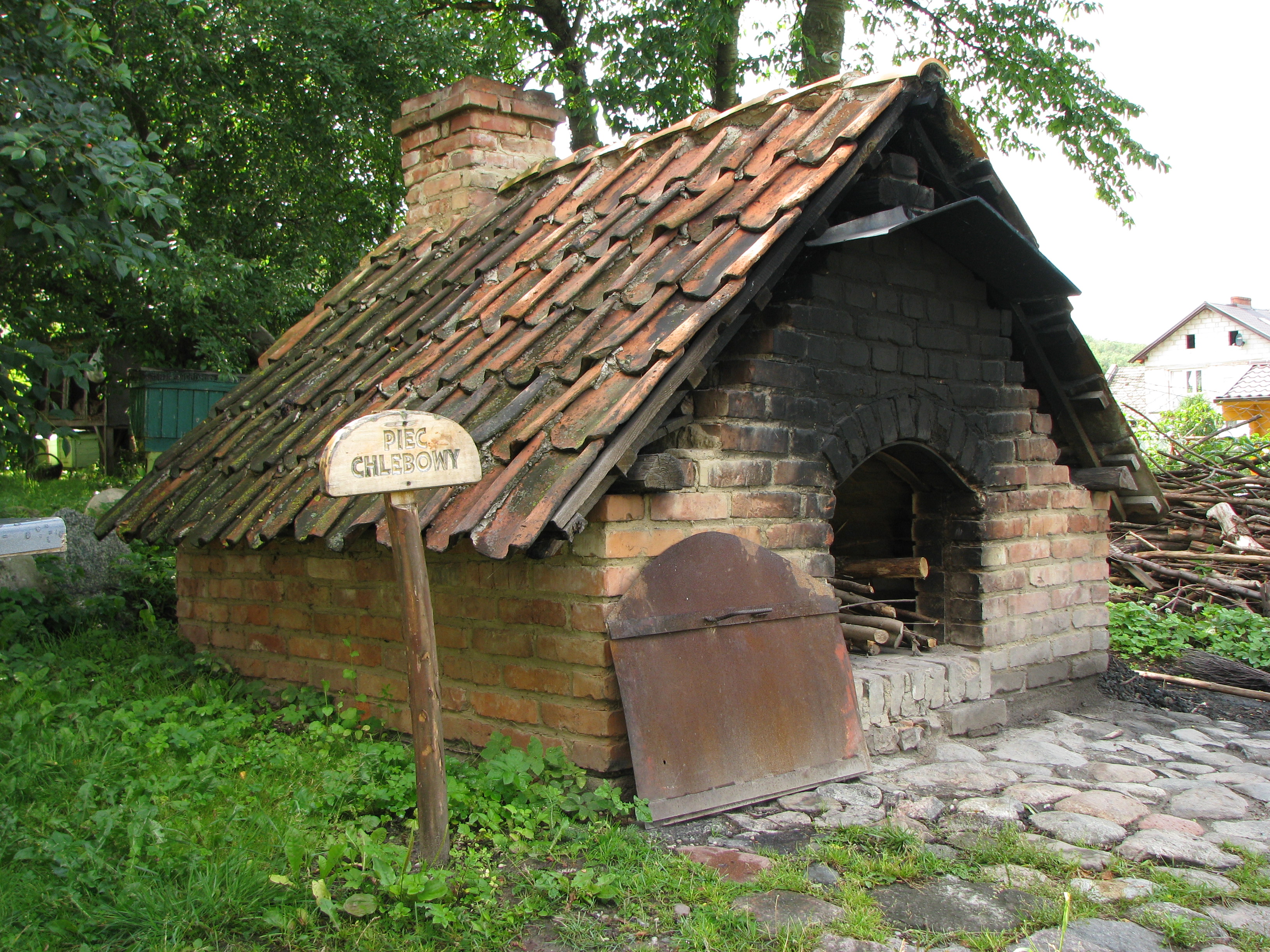 Piec chlebowy. Piec domkowy, osłonięty dwuspadowym dachem deskowym.