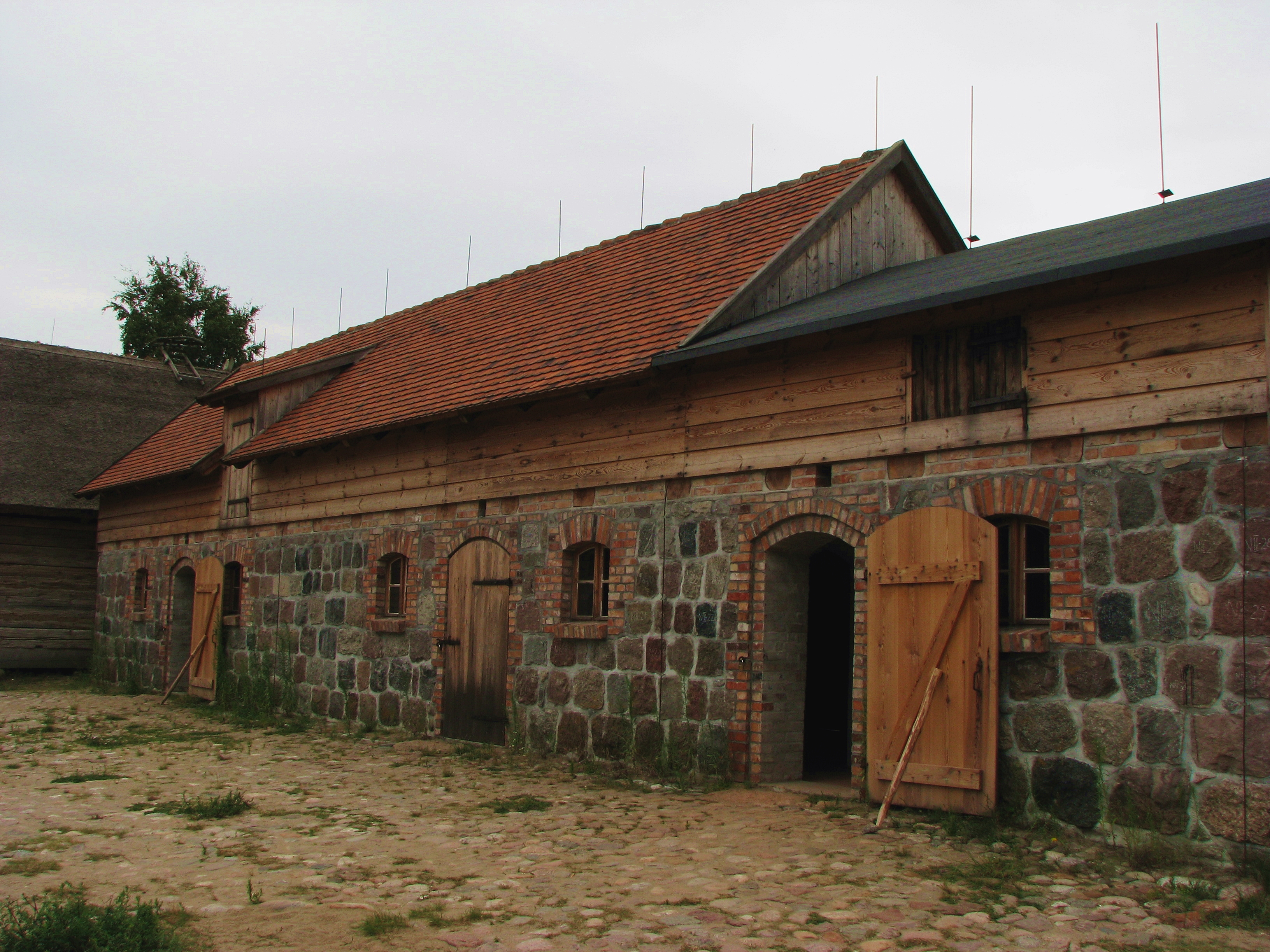 Chlew cegolano-kamienny z 1917 roku trójwnętrzny (obora, świniarnia i kuchnia gospodarcza z piecem chlebowym). Górny fragment ściany obity poziomo deskami. Dach dwuspadowy, kryty dachówką w wyższej części budynku, a w niższej części papą. Fragment kaszubskiej zagrody drobnoszlacheckiej ze wsi Czarna Dąbrowa. |
