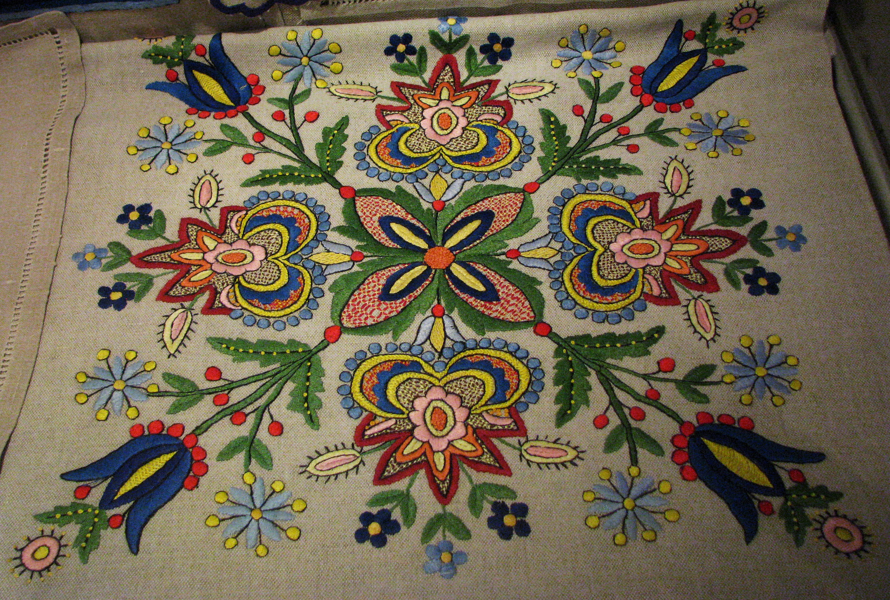 Element wystawy poświęconej wdzydzkiemu rękodziełu artystycznemu – haft kaszubski - wewnątrz chałupy gburskiej ze wsi Chrztowo z 1852 r.