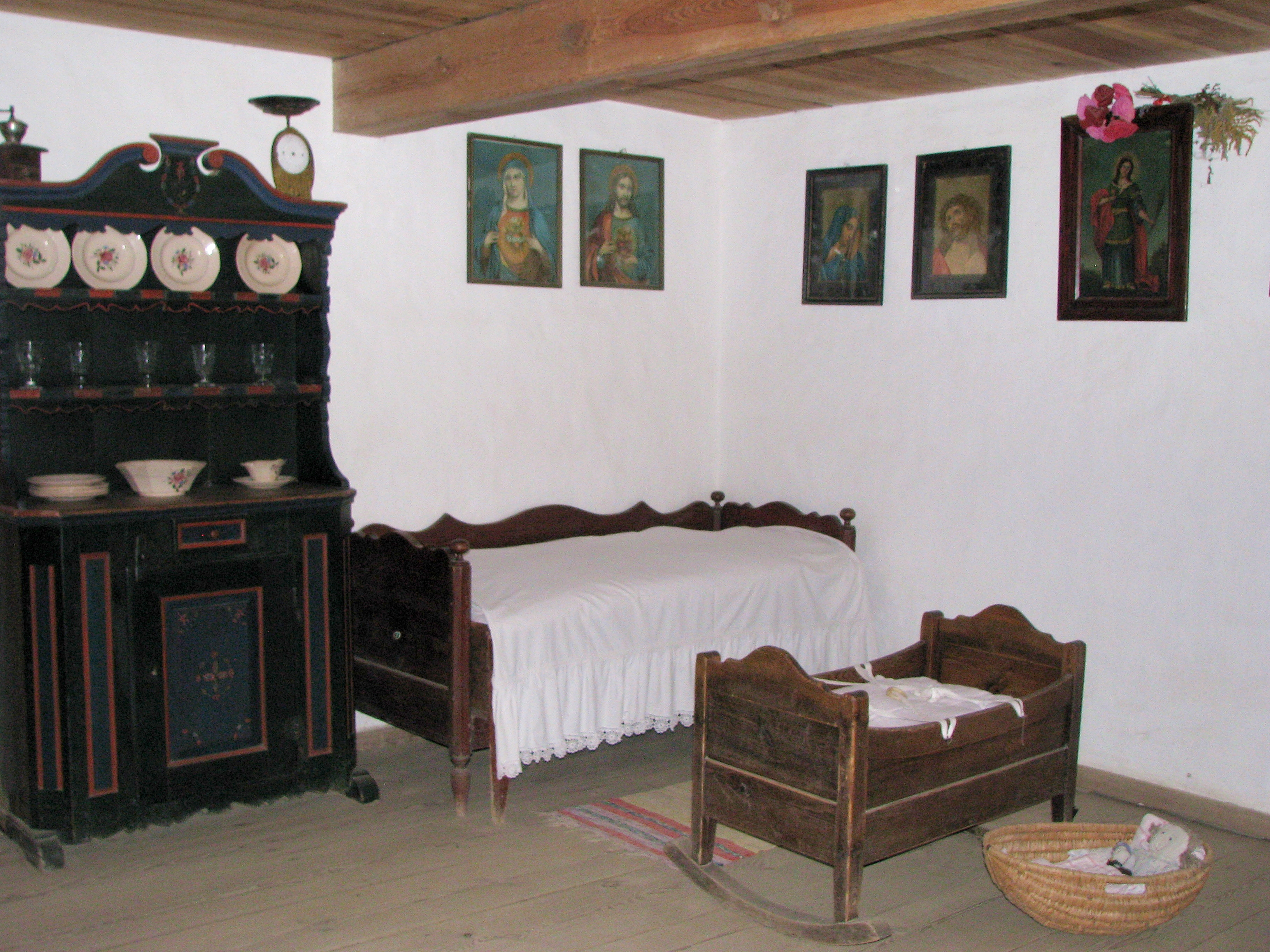 Wyposażenie chałupy ze wsi Lipuska Huta. Meble i sprzęty z XIX wieku. Na zdjęciu widoczne: drewniana kołyska na biegunach, kosz wiklinowy, ława rozsuwana (pełniąca funkcję łóżka), malowany kredens i święte obrazy na ścianach. Podłoga z desek.