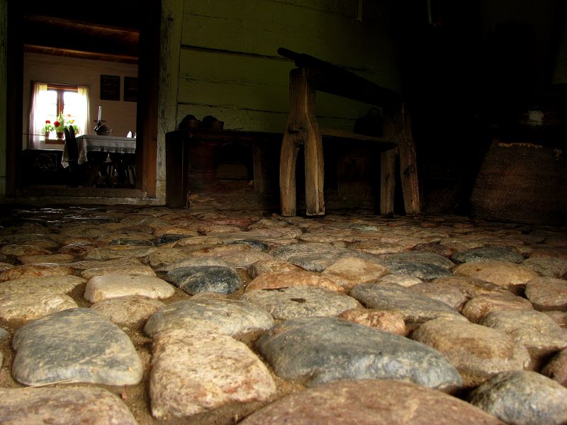Podłoga wyłożona polnymi kamieniami w sieni chałupy ze wsi Lipuska Huta.
