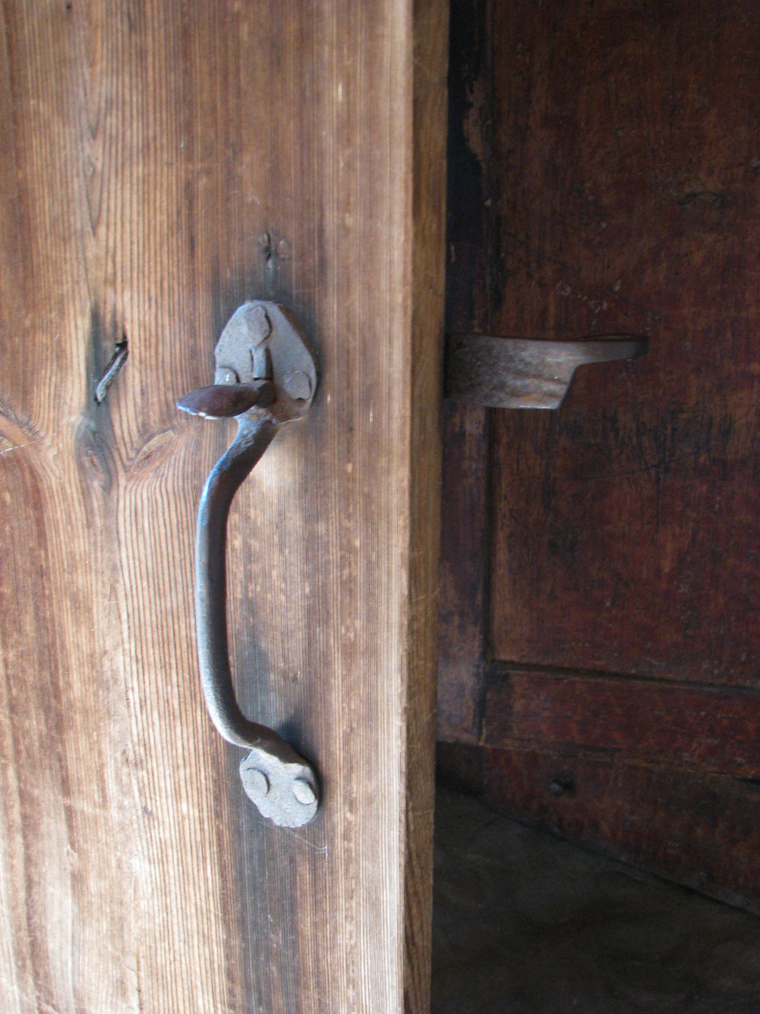 Tradycyjna klamka i mechanizm zamykający drzwi. Tutaj sfotografowany w drzwiach do toalety.