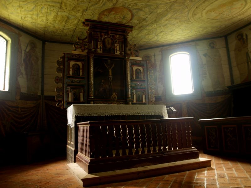 Ołtarz ze wsi Różyńsk Wielki (koło Pisza) z 1662roku. W trakcie konserwacji w 1909 r. odczytano nazwisko autora ołtarza, był nim Wenceslaus Paritus. Sufit i ściany budynku bogato polichromowane.