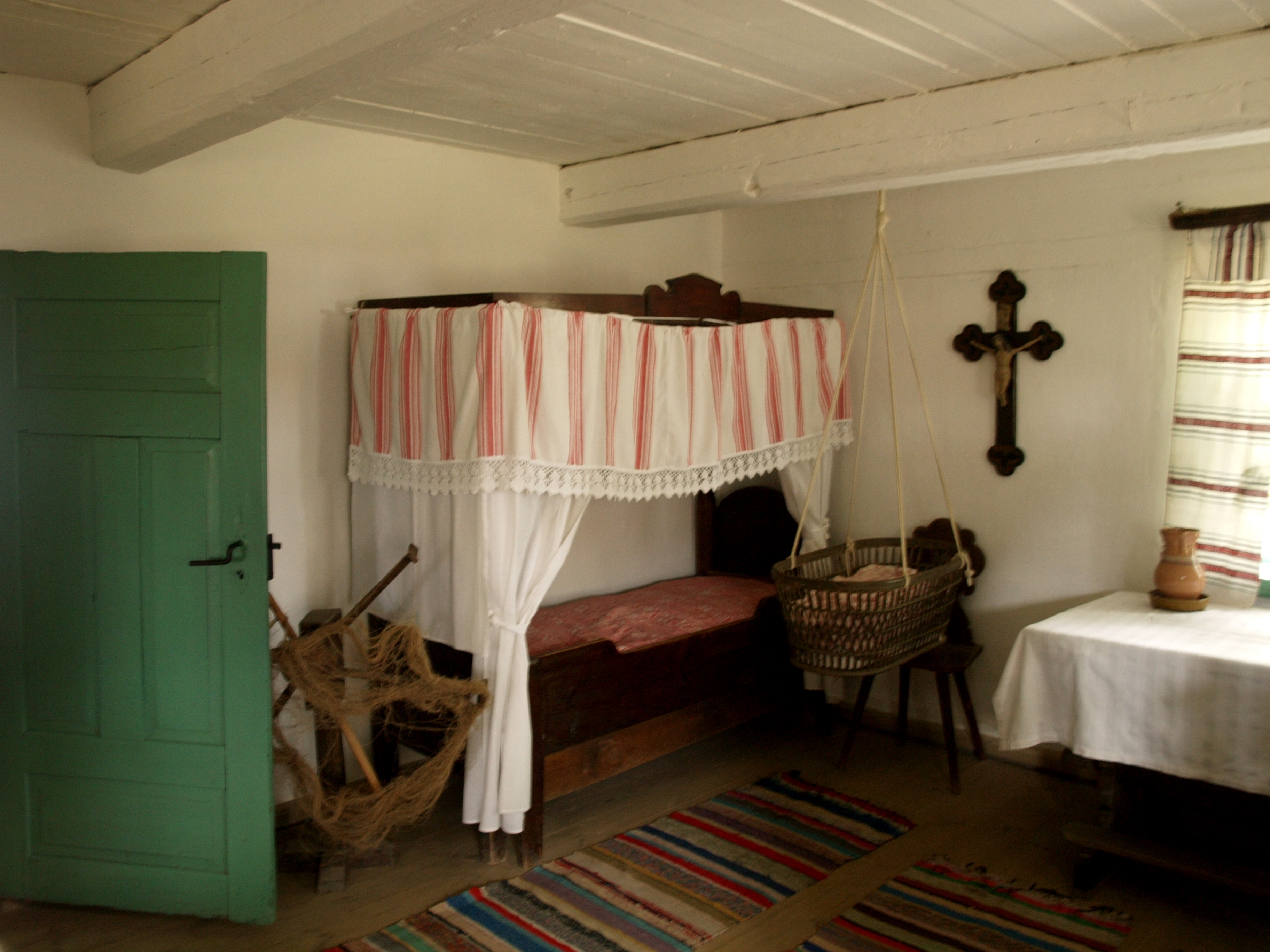 Wnętrze chałupy z przełomu XIX i XX wieku: łóżko z „podniebiziem” i wiklinowa kołyska zawieszona pod stropem.