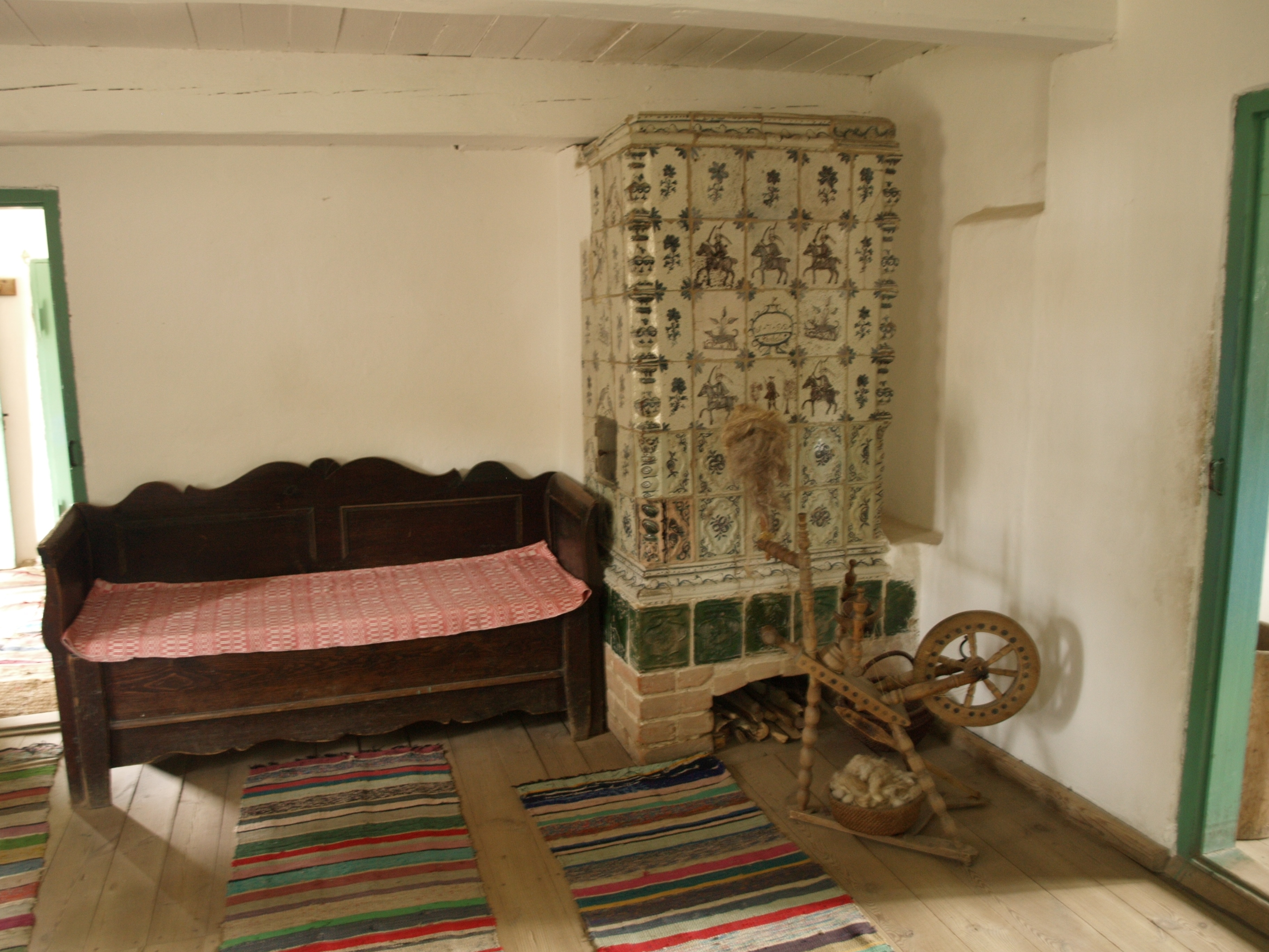 Piec z 1792 roku wykonany przez garncarza ludowego o nazwisku Pantell. Kafle ozdobne przedstawiają scenki rodzajowe i motywy kwiatowe. Obok drewniana ława z oparciem.