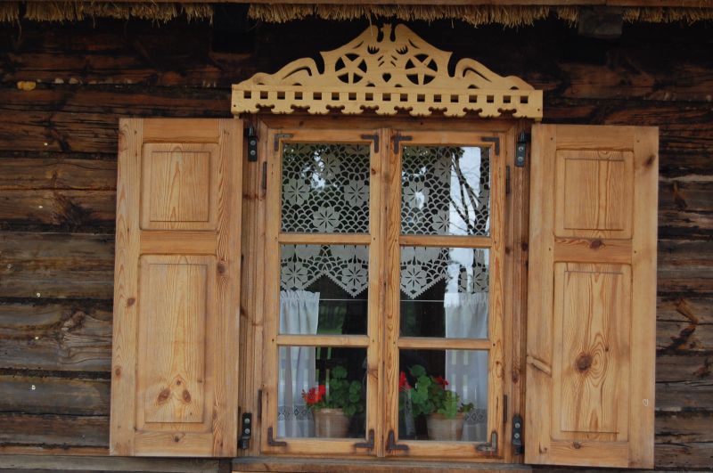 Okno chałupy kurpiowskiej (z widocznym zdobieniem okiennym „koruny”) przeniesiona z Tatar, zbudowana w 1948r. konstrukcja zrębowa, typ asymetryczno-dośrodkowy; system ogniowy tworzy kuchnia i piec z kafli. Kasa biletowa i sklep z pamiątkami.