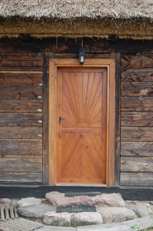 Drzwi chałupy kurpiowskiej ze wsi Tatary. Na zdjęciu widoczne charakterystyczne zdobienie szalunkowe z motywem solarnym oraz kamienny prób przed wejściem.