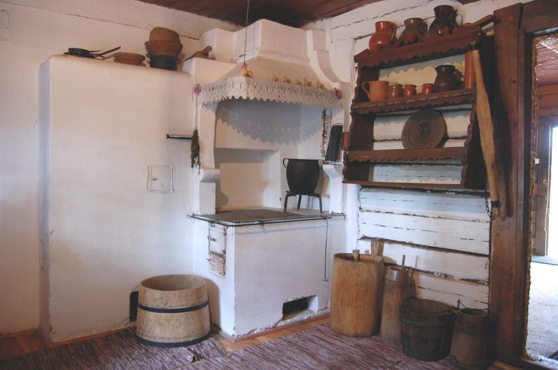 Piec w małej izbie chaty kurpiowskiej pochodzącej z początku XIX wieku ze wsi Golanka.