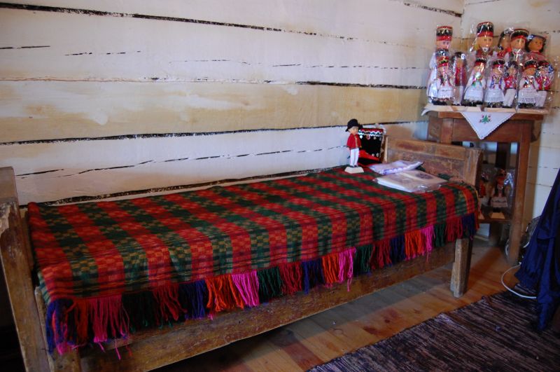 Łóżko z początku XX wieku, w tle lalki w strojach kurpiowskich. Na łóżku tkany kilim.